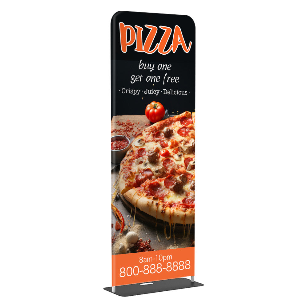 Tension Fabric Stands are premium indoor displays. The interlocking tube hardware is lightweight and built for lightning quick setups, no tools necessary! Once the hardware is in place just slip the "pillow-case" stretch fabric graphic over the frame, zip the graphic closed and set-up is complete. Graphics are full-color custom dye-sub. Add the double-sided option for twice the graphic impact.